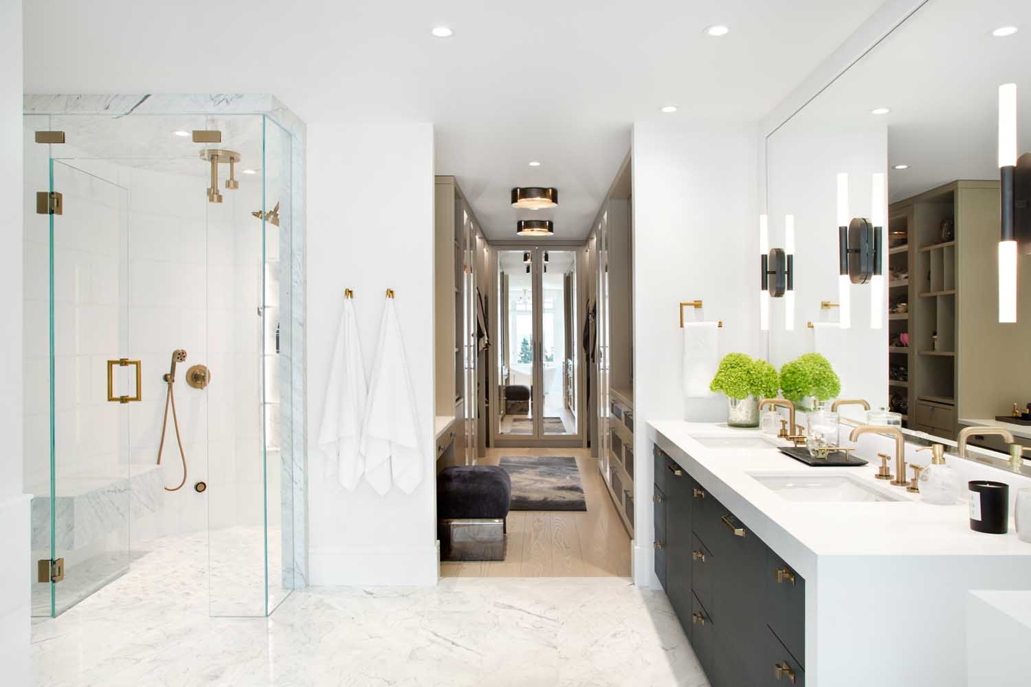 衛生間的設計是業(yè)主比較關(guān)注的空間。我們設計了梳妝臺來(lái)容納一個(gè)大理石水槽,與明亮的白色臺面和大理石瓷磚形成強烈對比,同時(shí)拉出大理石紋理的深色。浴室柜使用了炭灰色門(mén)板,配有金色拉絲五金是整個(gè)空間看起來(lái)更加高級,這種金色拉絲的五金運用到了幾乎所有空間,這讓各個(gè)空間互相呼應,風(fēng)格更加協(xié)調統一。